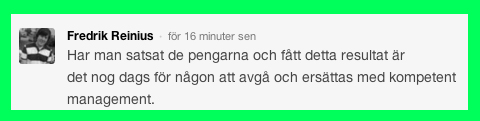 Med kommentaren "Har man satsat de pengarna och fått detta resultat är det nog dags för någon att avgå och ersättas med kompetent management." så sätter Fredrik ribban på en riktigt låg höjd för hur Europas storklubbar kommunicerar sina åsikter om sina konkurrenter externt.